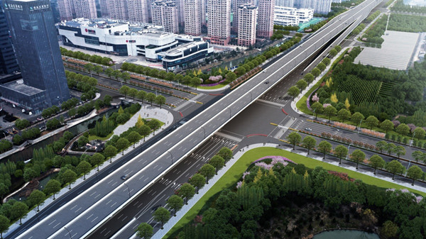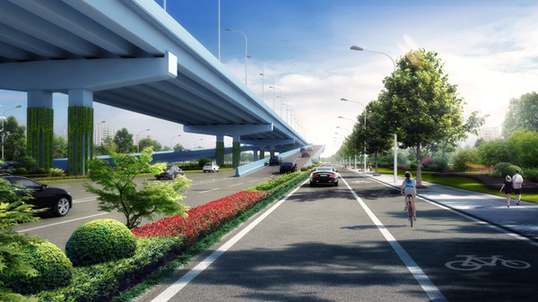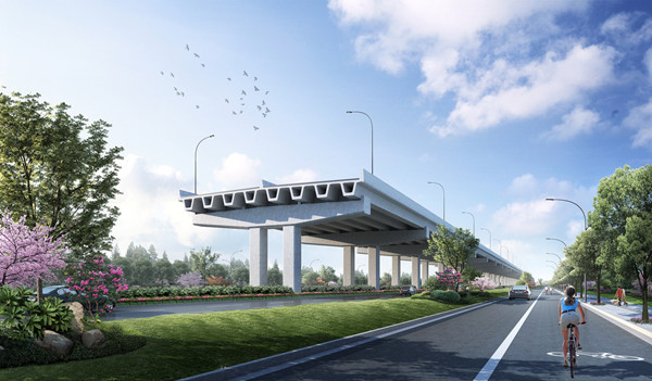 該工程采用“主線高架+地面輔道”的建設形式,其中主線高架為雙向6車道,地面輔道為雙向6車道+兩側機非混行道;高架設計速度80公里/小時,地面主車道設計速度50公里/小時;同步實施雨水、電力、燃氣、給水和綜合通信等管線工程,以及景觀綠化工程。