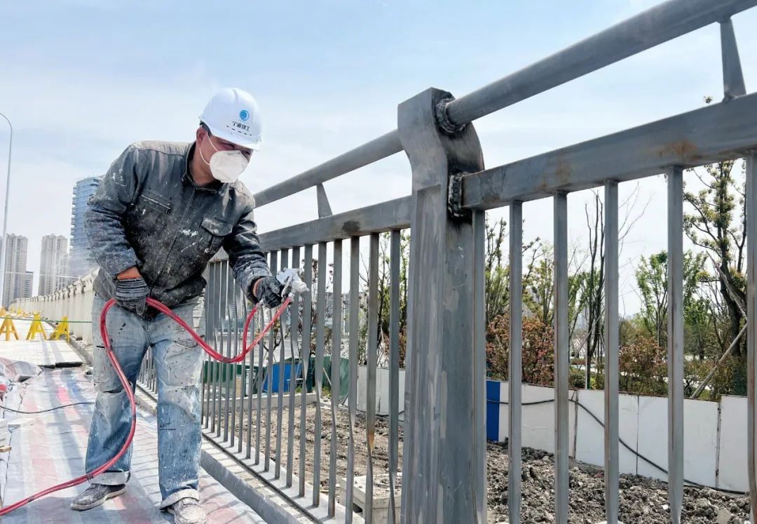 清明小長假期間,該工程全體施工人員和管理人員沒有放假。47歲的油漆工魯云華正在給大橋護欄噴灑油漆,他笑著說:“早上7點就到工地了,大橋離通車越來越近了,得抓緊時間搶工期!”