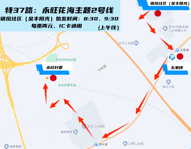 該線單程15分鐘,上午從銀鳳社區(金豐陽光)公交站出發,途經軌道二號線五里牌站后,最后到達永旺村委,始發時間有兩班分別為8:30和9:30,下午從永旺村委站出發,兩班時間分別為13:30、14:30,先后在銀鳳社區(金豐陽光)、五里牌站停靠。
