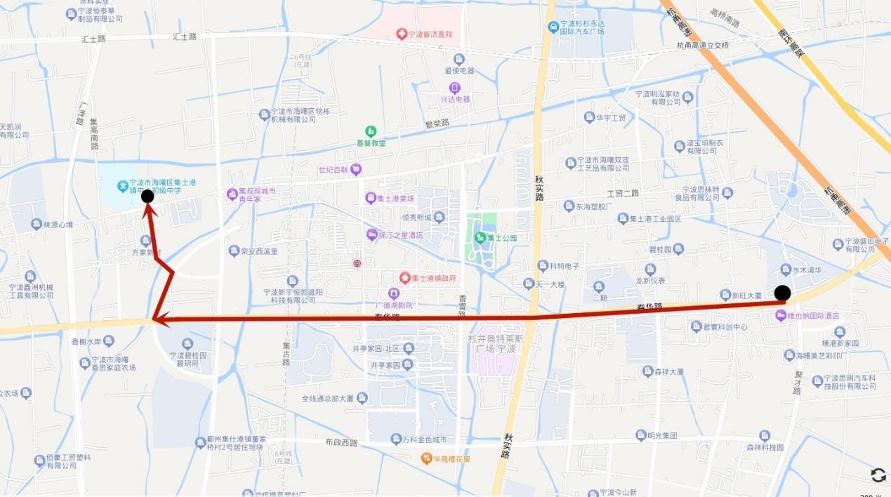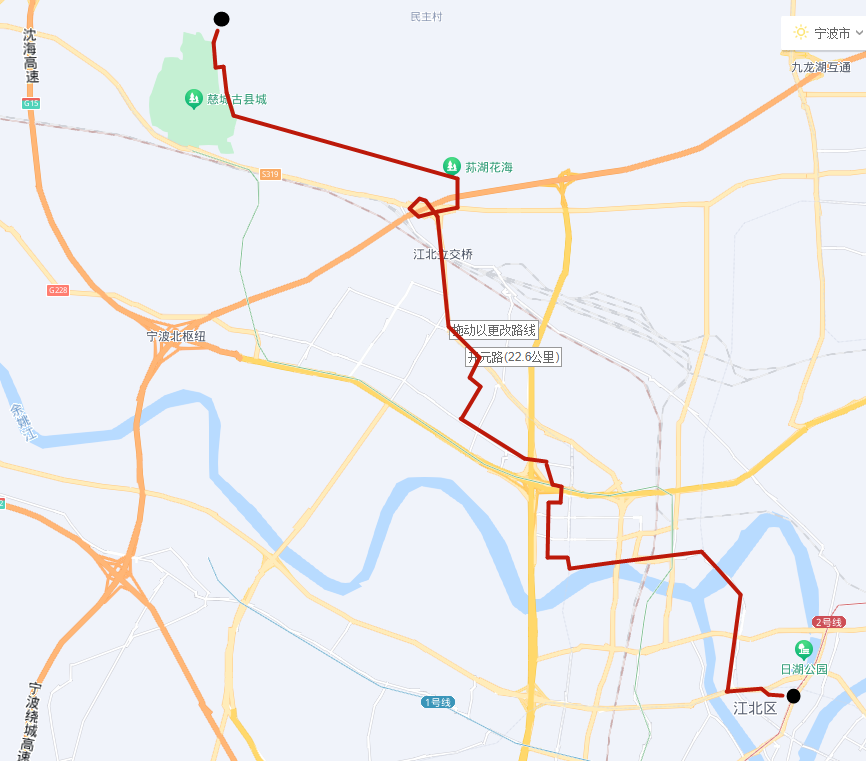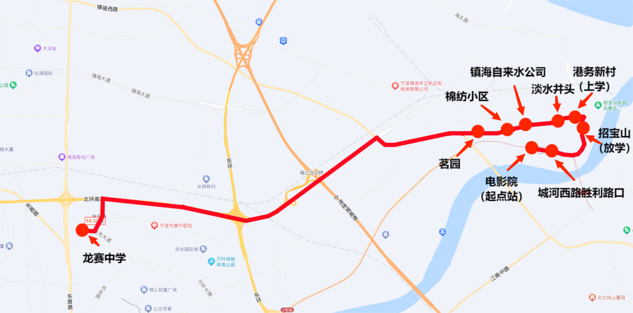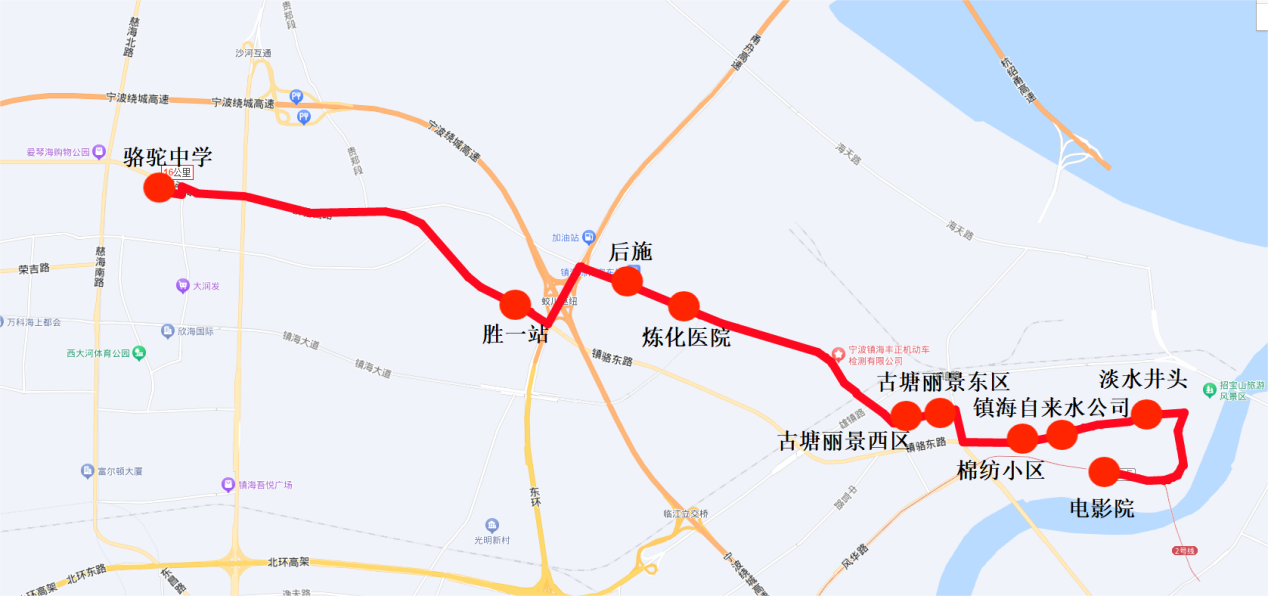 站點設置:公元世家、莊市街道行政服務中心、漢塘路逸夫路口、招呼站(鎮海區實驗小學南門)