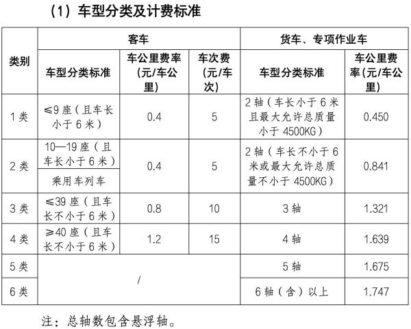 相關車型的收費里程,詳見下表(最終收費標準以省政府批復為準):