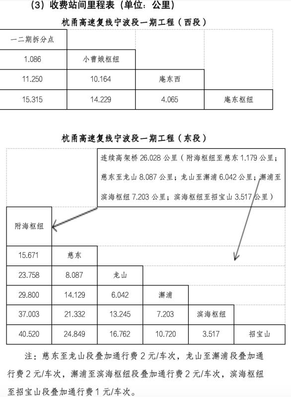 以一輛普通7座以下客車為例,從鎮海招寶山收費站到慈東收費站,全程約24.849公里,通行費為:0.4元/公里*24.849公里+7元大橋疊加費+5元車次費(貨車沒有車次費)=21.9元。