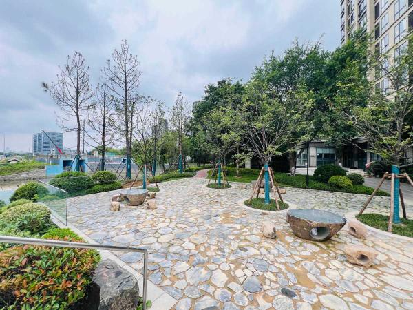 在下穿通道的江灣花苑側入口處,“甬小園”成為亮點。石桌石椅錯落有致,與附近公園相連,為居民提供休閑空間。