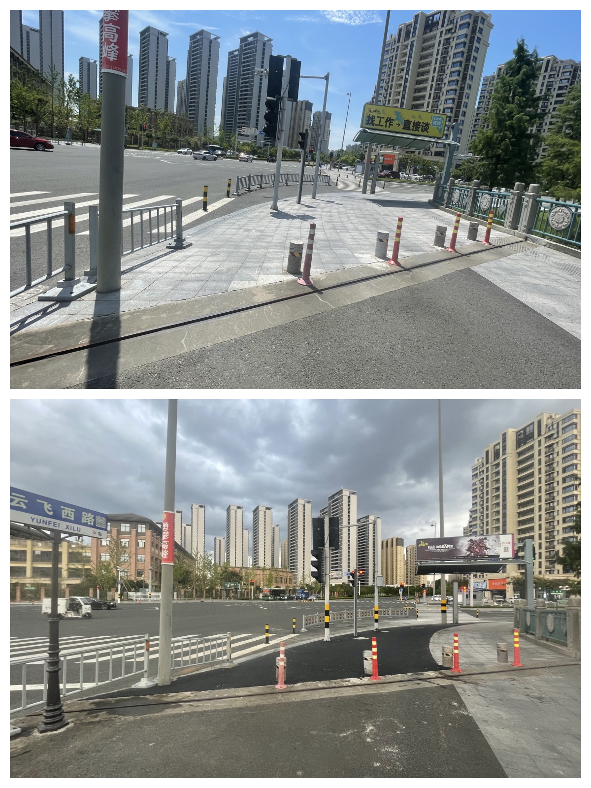云飛路與洪都路交叉口、云飛路與機場北路交叉口的非機動車道下坡段原先采用花崗巖鋪裝,雨天十分濕滑,同時此處前方為紅綠燈路口,非機動車若急剎容易導致車輛打滑。