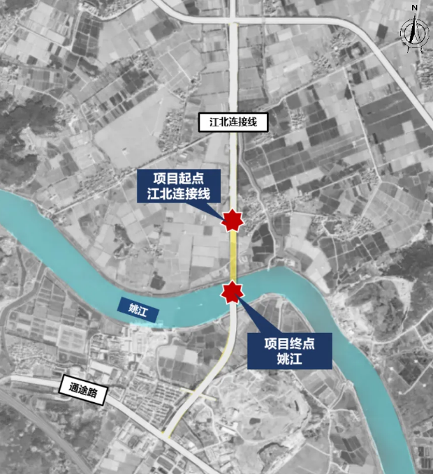 228國道海曙段工程(姚江-通途路)(江北)項目,北起江北連接線,南至姚江,道路長約0.58公里,過江橋梁處寬度38米,過江后與現狀道路接順,道路等級為一級公路,設計速度80km/h。