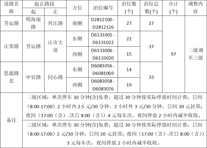 即日起調(diào)整芳辰路、莊榮路、思源路北路內(nèi)泊位收費標(biāo)準(zhǔn)。本次調(diào)整泊位收費標(biāo)準(zhǔn)公告如下: