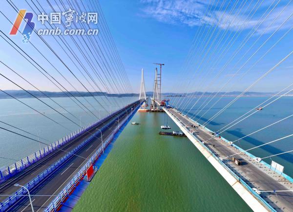 象山港畔,運梁船精準就位,建設者們手持對講機反復協調確認。兩座“鉆石”造型的雙子星塔之間,鋼箱梁緩緩升空,海面保障船舶巡回護航,海陸協同上演著跨海筑橋的奮進圖景。