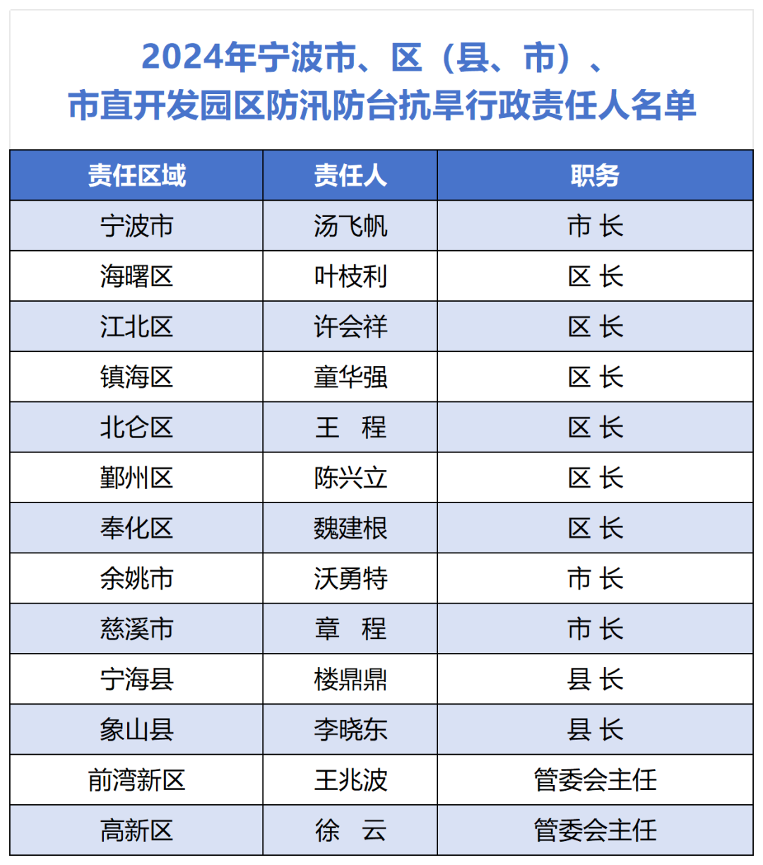 寧波市人民政府防汛防臺(tái)抗旱指揮部公布2024年度防汛防臺(tái)抗旱行政責(zé)任人及“市領(lǐng)導(dǎo)包縣”“縣領(lǐng)導(dǎo)包鄉(xiāng)”包保責(zé)任人名單。