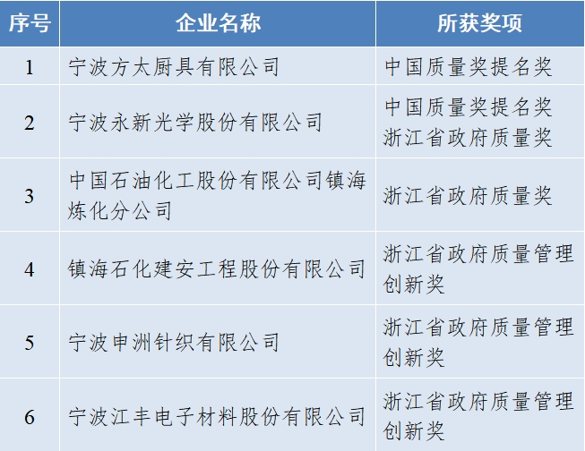 浙江省政府質(zhì)量獎(jiǎng)組織名單