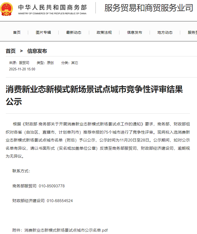 11月20日,商務部網站公布了消費新業態新模式新場景試點城市競爭性評審結果公示,確定了包括寧波在內50城入選。公示時間截至28日。